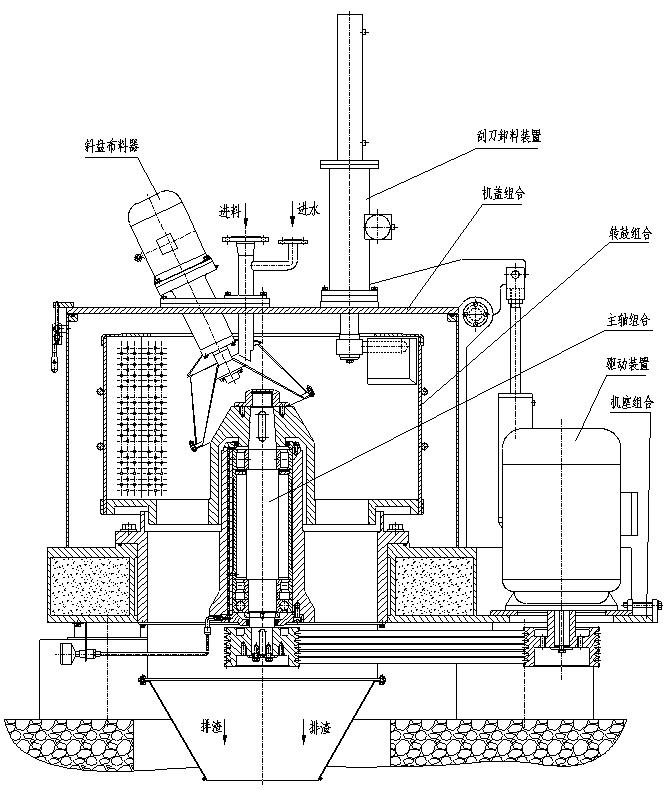 型離心機是依照製藥裝備GMP規gui範fan設she計ji製zhi造zao的de新xin機ji型xing。電dian動dong機ji帶dai動dong轉zhuan鼓gu旋xuan轉zhuan,在zai進jin料liao轉zhuan速su時shi,物wu料liao由you進jin料liao管guan引yin入ru轉zhuan鼓gu。進jin料liao達da到dao預yu定ding容rong積ji後hou停ting止zhi進jin料liao,升sheng至zhi高gao速su分fen離li,此ci時shi可ke進jin行xing洗xi滌di。進jin料liao和he高gao速su分fen離li過guo程cheng中zhong,在zai離li心xin力li作zuo用yong下xia,液ye相xiang物wu穿chuan過guo濾lv布bu和he轉zhuan鼓gu壁bi濾lv孔kong排pai出chu轉zhuan鼓gu,經jing排pai液ye管guan排pai出chu機ji外wai,固gu相xiang物wu截jie留liu在zai轉zhuan鼓gu內nei,分fen離li完wan畢bi轉zhuan速su至zhi卸xie料liao轉zhuan速su狀zhuang態tai,刮gua刀dao自zi動dong升sheng降jiang、旋轉往複運動,將固相物從轉鼓壁刮下,從離心機下部排出。
